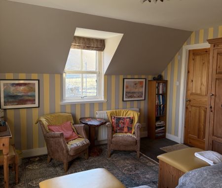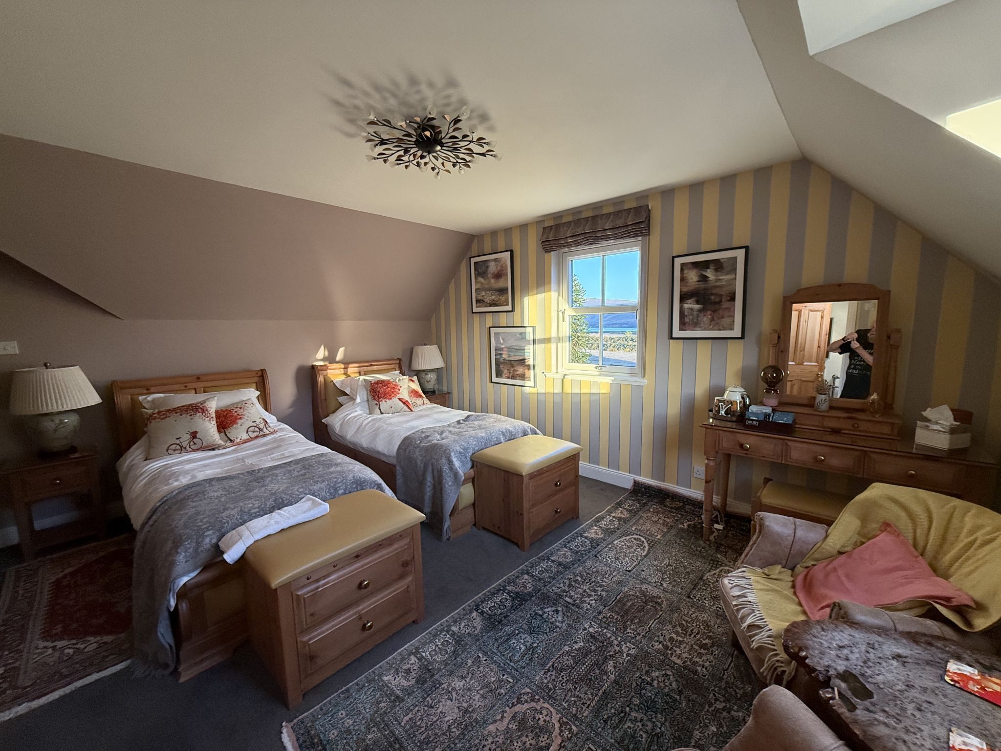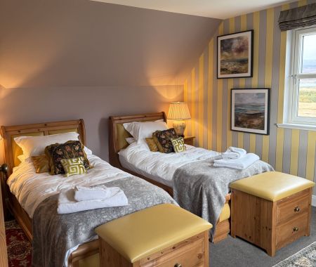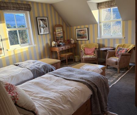 A spacious twin room with views of flower garden, fruit trees, farmland, forestry and mountains and out to the Fannichs in the distance.